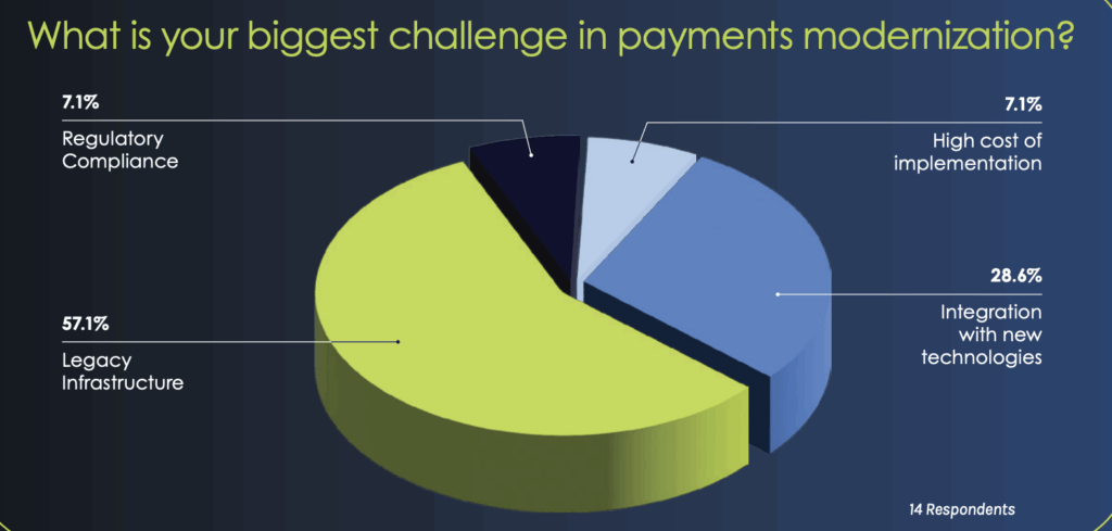 The poll showed that 57.1% of participants identified legacy infrastructure as their biggest challenge in payment modernization. Gupta wasn’t surprised by this result, noting, “It’s more so a testament to the scour of legacy infrastructure, really a lead balloon that makes it very difficult to move.”