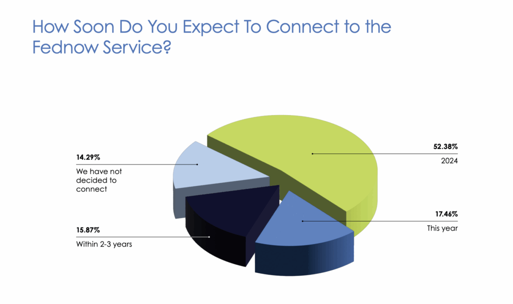 The webinar began with an audience poll, where they were asked how soon they planned to connect to the FedNow Service. A huge majority of the 64 participants, 52.38%, planned on connecting in 2024, 17.46% in 2023, and 15.87% within 2-3 years.