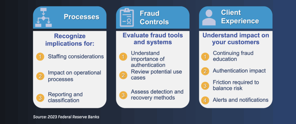 “Think through debit and credit card transactions—you’re not approving those after 5:00 p.m. The FedNow payment is ISO 20022 payment flow, so it’s not a human-sourced transaction. It is moving across the network as a customer enters it into the FedNow Service. Think about all the things that you could change in order to become operational around the clock, and if there are things that you can leverage that you’re doing today into the future. You want to think through as well how you’re going to handle settlements. And then how do you want to carry that forward into instant payments? And if at any point in these considerations you want to bounce ideas off of an expert, you have your Fed relationship manager awaiting your call to help guide you through some of these thoughts and considerations.”