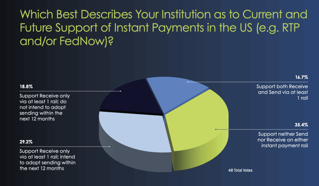 A second poll was conducted during the webinar to understand financial institutions’ current and future support of instant payments in the U.S. The results revealed that 35.40% of respondents neither Send nor Receive on either instant payment rail, while 29.2% support Receive Only via at least one rail and intend to adopt Send within the next 12 months. Additionally, 16.7% support both receiving and sending via at least one rail. “What surprises me here the most is actually the support of both Receive and Send. I wasn’t expecting that high, actually. We’re seeing still some reluctance around the Send, of course, it’s going to depend on segment and tier,” Gupta observed.