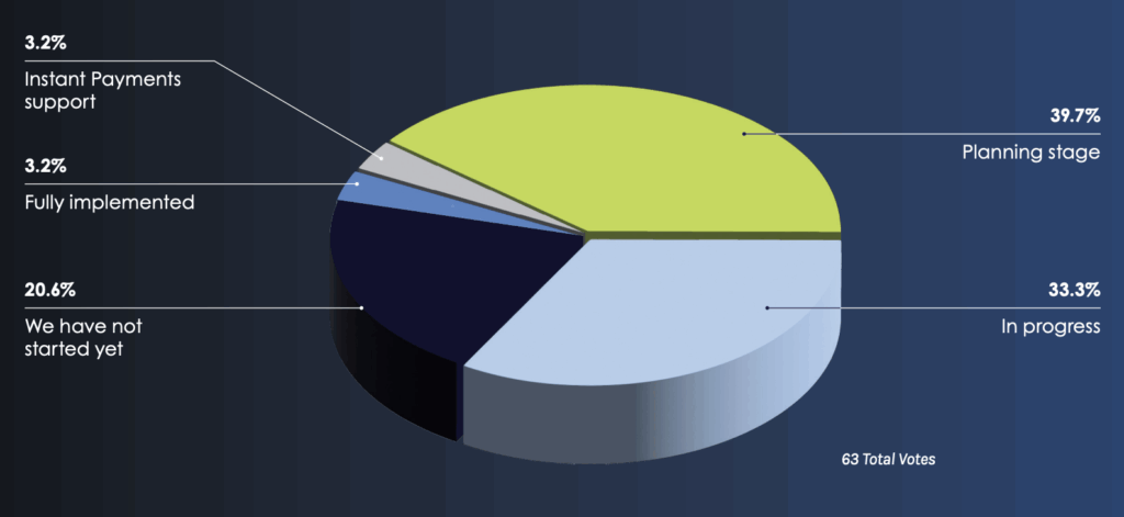 During the webinar, a poll was conducted to gauge the current state of ISO 20022 implementation among attendees. The poll revealed that 39.7% of organizations are in the planning stage, 33.3% are in progress, 3.2% have fully implemented the standard, and about 20.6% have not started yet. “Typically, what we’ve seen is about a third, a third, a third.