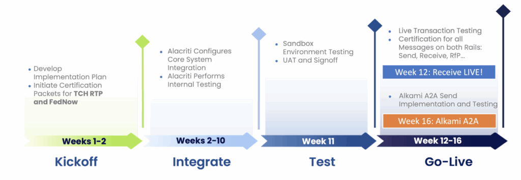 Alacriti works closely with the institution to develop a comprehensive implementation plan. This includes initiating certification packets for both the RTP network and the FedNow Service, setting up settlement positions, and ensuring all regulatory and operational requirements are met.