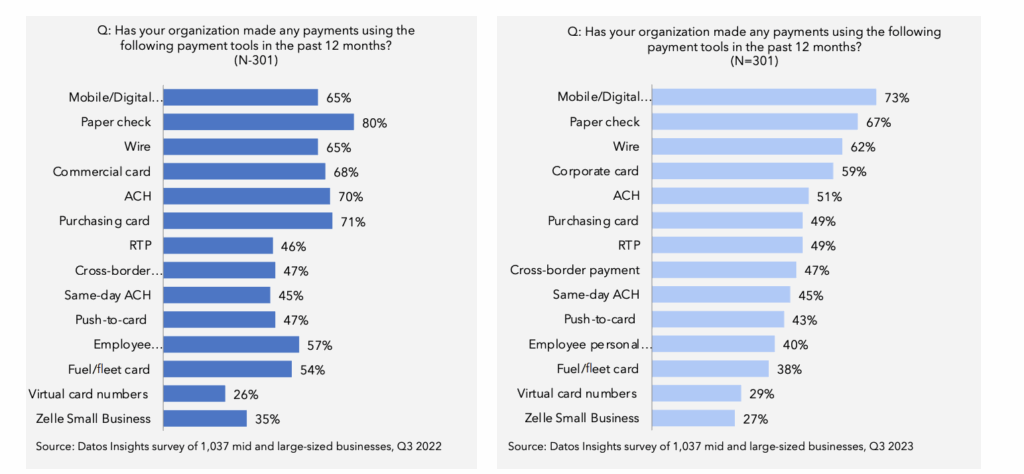 One of the most significant findings from Datos Insights’ research is the discrepancy between bank implementations and business usage of realtime payments. Many businesses are turning to financial institutions with the necessary capabilities or directly engaging with fintechs, especially for intelligent or automated payable solutions. Baumann pointed out, “Businesses need help with determining what payment method they’re going to use, when, and what’s the most cost-effective and fastest method.”