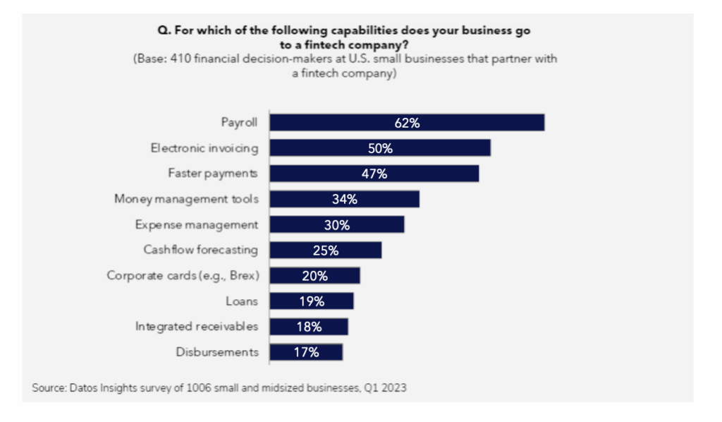 The number of businesses partnering with a fintech for payments services is increasing significantly. 65% of businesses say they’re partnering with a fintech for core cash management or payment needs, showing that payments functionality is a huge market opportunity for fintechs to out-sell banks. This disintermediation is driven by factors such as ease of submitting payment files, better reporting, and access to faster payments. In addition, banks recognize that payment volumes are being lost to fintechs.