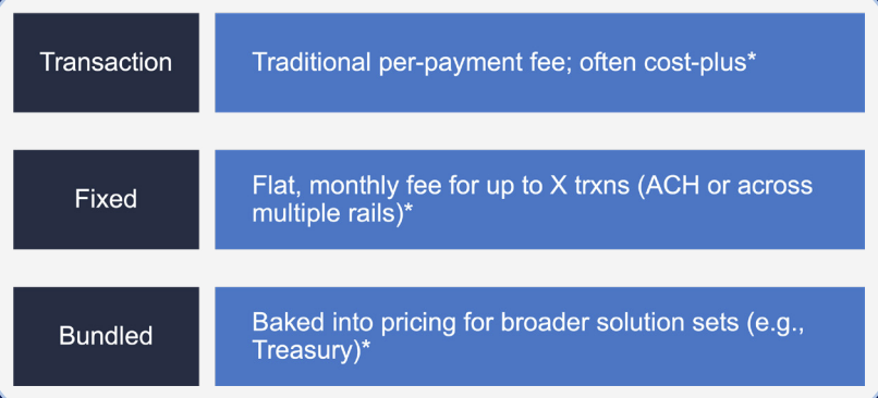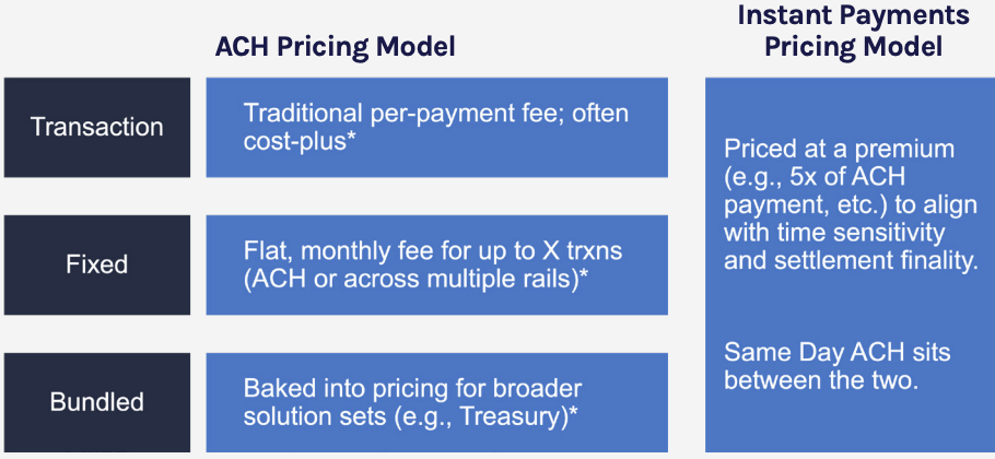 Across the market, several models have emerged. “A couple of different models—either on a per-transaction or per-click, a fixed sort of all-you-can-eat or bundled, especially when we’re getting into the commercial space,” Gupta explained. Many institutions continue to package ACH and treasury solutions together for simplicity, but the addition of instant payments introduces new dynamics—and new opportunities to align pricing with value,