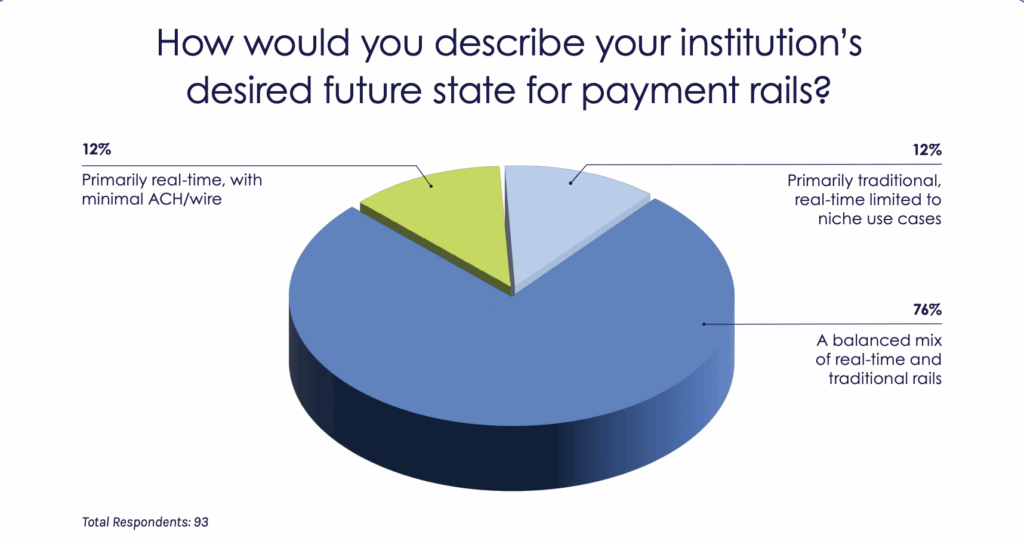 The second audience poll asked participants how they envision their institution’s future state for payment rails. The results revealed strong consensus around balance rather than replacement. A majority (76%) indicated that their goal is to maintain a balanced mix of real-time and traditional rails, while just 12% selected primarily real-time with minimal ACH or wire use, and another 12% said they expect to remain primarily traditional, with real-time limited to niche use cases.