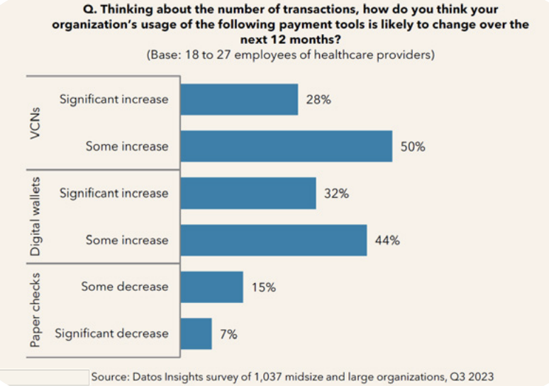 The healthcare industry is, of course, not exempt from the progress of digital transformation. Providers expect to increase both digital wallet and virtual card use, according to a Datos Insights survey. As fintech continues to expand in healthcare payments, these methods are expected to become more readily available to downstream payment partners.