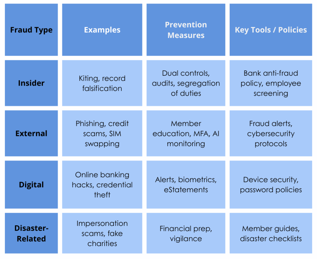 Banks and credit unions encounter fraud risks ranging from insider schemes, such as kiting, to external scams like phishing and SIM swapping. Effective fraud prevention combines strong internal controls, regular audits, and dual controls with member education, multi-factor authentication (MFA), and timely fraud alerts. A comprehensive bank anti-fraud policy and program not only help reduce fraud losses and protect personal information but also ensure a positive and secure member experience.