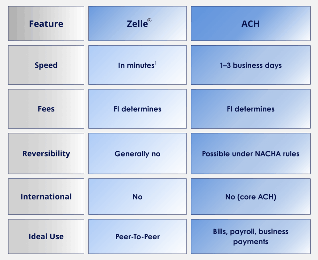 When deciding which method to use, consider the nature of your transaction—personal or business, instant or scheduled—and how significant reversibility or dispute protections are for the transaction. The right payment method ultimately depends on balancing speed, cost, security, and geographic needs. ACH is better suited for consistent and predictable recurring payments, while Zelle® is designed for fast and easy P2P payments and is typically used for one-time or occasional payments between people who know and trust each other.