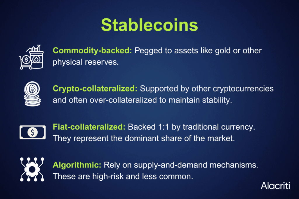 Stablecoins fall into four main categories: Commodity-backed, pegged to assets like gold or other physical reserves; Crypto-collateralized, supported by other cryptocurrencies and often over-collateralized for stability; Fiat-collateralized, backed 1:1 by traditional currency (e.g., USD) and representing the dominant share of the market; and Algorithmic, which rely on supply-and-demand mechanisms but are high-risk and less common.