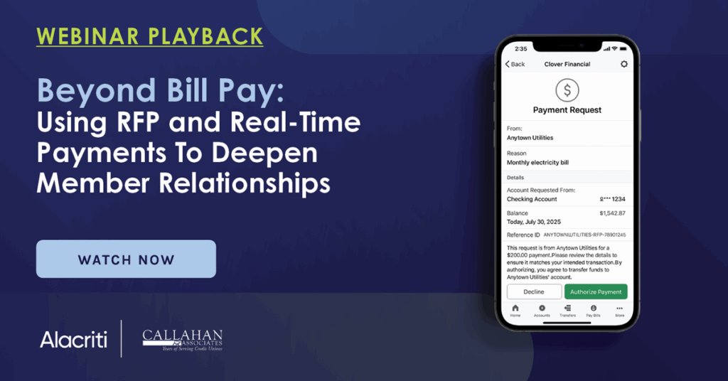 Join us for a Callahan-hosted webinar featuring Stuart Bain, SVP of Product Management at Alacriti, and Mark Majeske, SVP of Faster Payments at Alacriti and Board Advisory Group member of the U.S. Faster Payments Council. Together, they break down how RFP works today, what’s next for this capability on the RTP® network and FedNow® Service, and why credit unions should be connecting the dots between RFP, loan payments, and real-time payments.