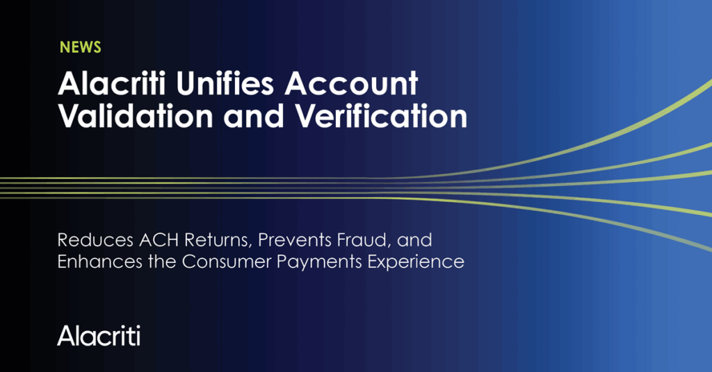 - Alacriti has launched Orbipay BVV, a unified, real-time service that pairs Bank Account Validation for Nacha web-debit compliance with ~95% U.S. account coverage.